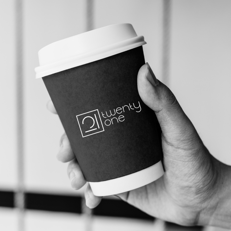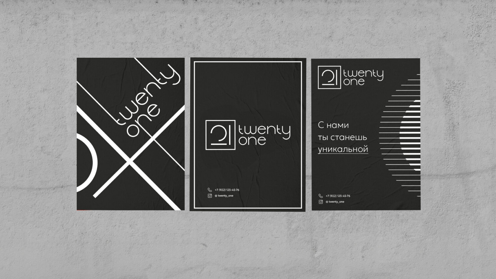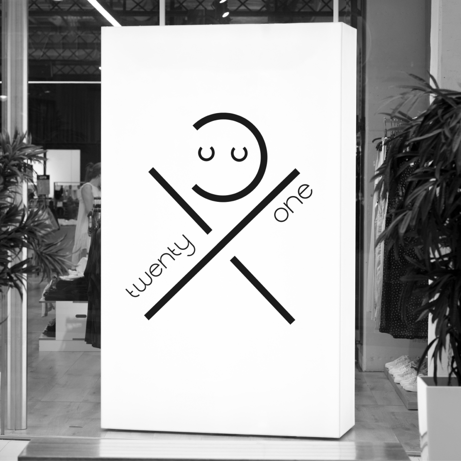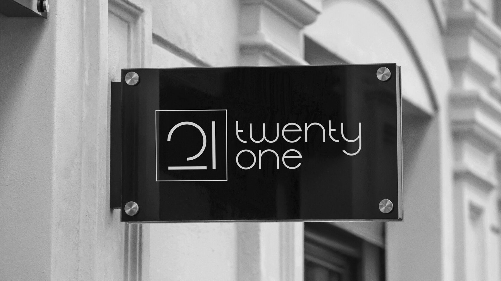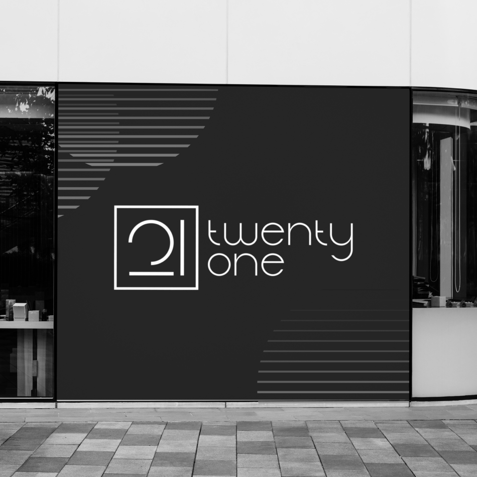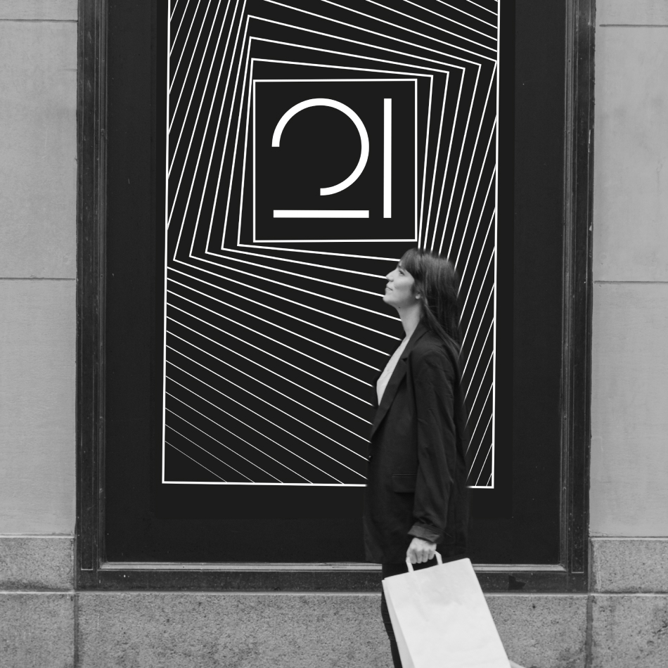 Логотип использует монохромную цветовую палитру, обеспечивая контраст и легкость восприятия на рекламных носителях. Типографика исполнена в двух стилевых вариациях: графический элемент «21» в квадрате создает фокус и визуальный вес, в то время как прописные буквы тонким шрифтом без засечек уравновешивают композицию своей горизонтальной ориентацией. Между элементами логотипа соблюдается баланс пустого пространства, что улучшает читаемость и визуальное восприятие. Динамику брендингу придает сочетание геометрических абстрактных форм, позволяя экспериментировать с верхними и нижними выносными элементами леттеринга, фирменными паттернами и ориентацией лого.