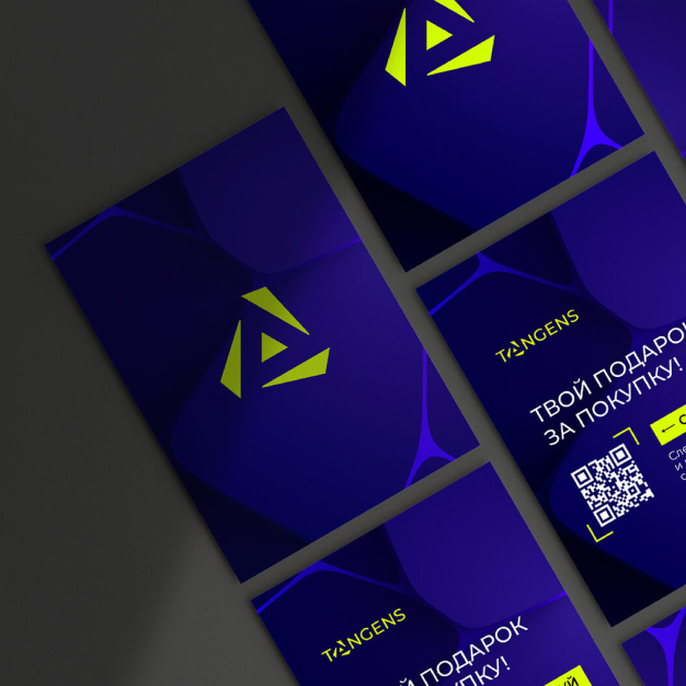 Таким образом, знаком Tangens является минималистичная буква «А», собранная из треугольников. В лого она отлично вписывается в общий буквенный ряд. Также эти элементы подчёркиваются яркой и динамичной айдентикой.