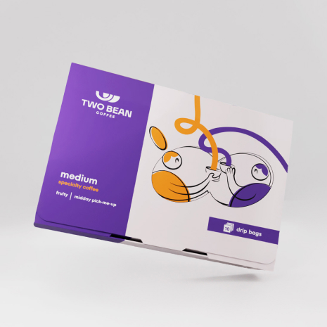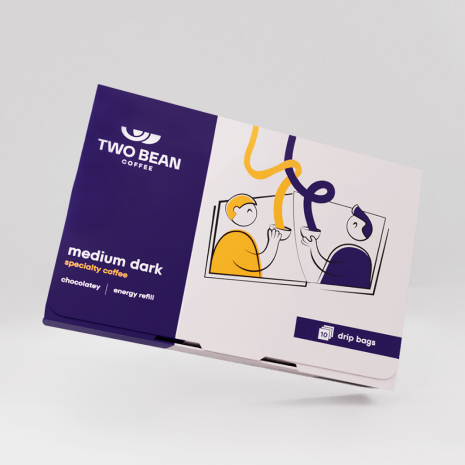Two Bean Coffee — это бренд из США, созданный двумя энтузиастами, объединёнными общей страстью к кофе и предпринимательству. Бренд выходит на рынок со своим флагманским продуктом — дрип-пакетами, продукт будет иметь 4 вариации: легкая, средняя, темная обжарка и ассорти.