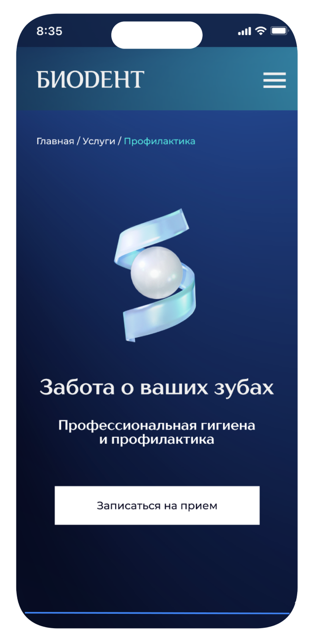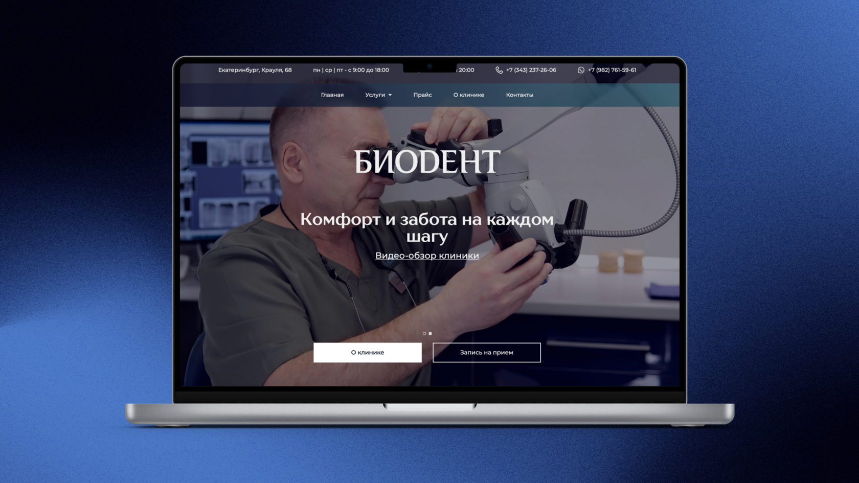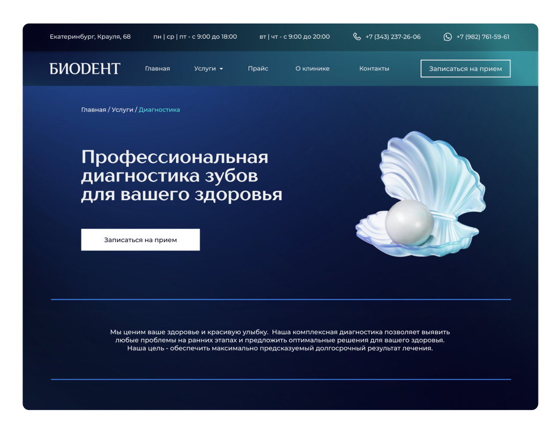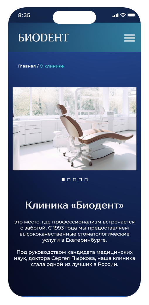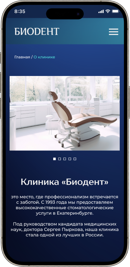 Разработка сайта для стоматологической клиники «Биодент» в Екатеринбурге, которая более 30 лет успешно работает на рынке и придерживается европейских и американских стандартов качества, обеспечивая максимальную безопасность и предсказуемый результат для каждого пациента.